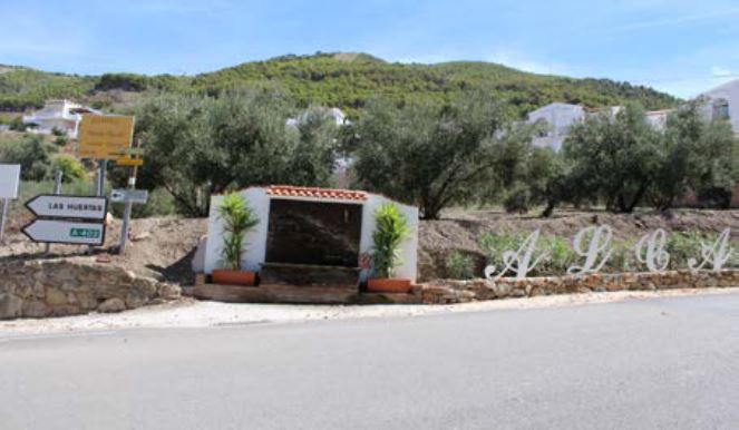 17. Take the next left following signs for Las Huertas and A-402 beside a water feature fountain and large white sign saying ALCAUCIN(see below)